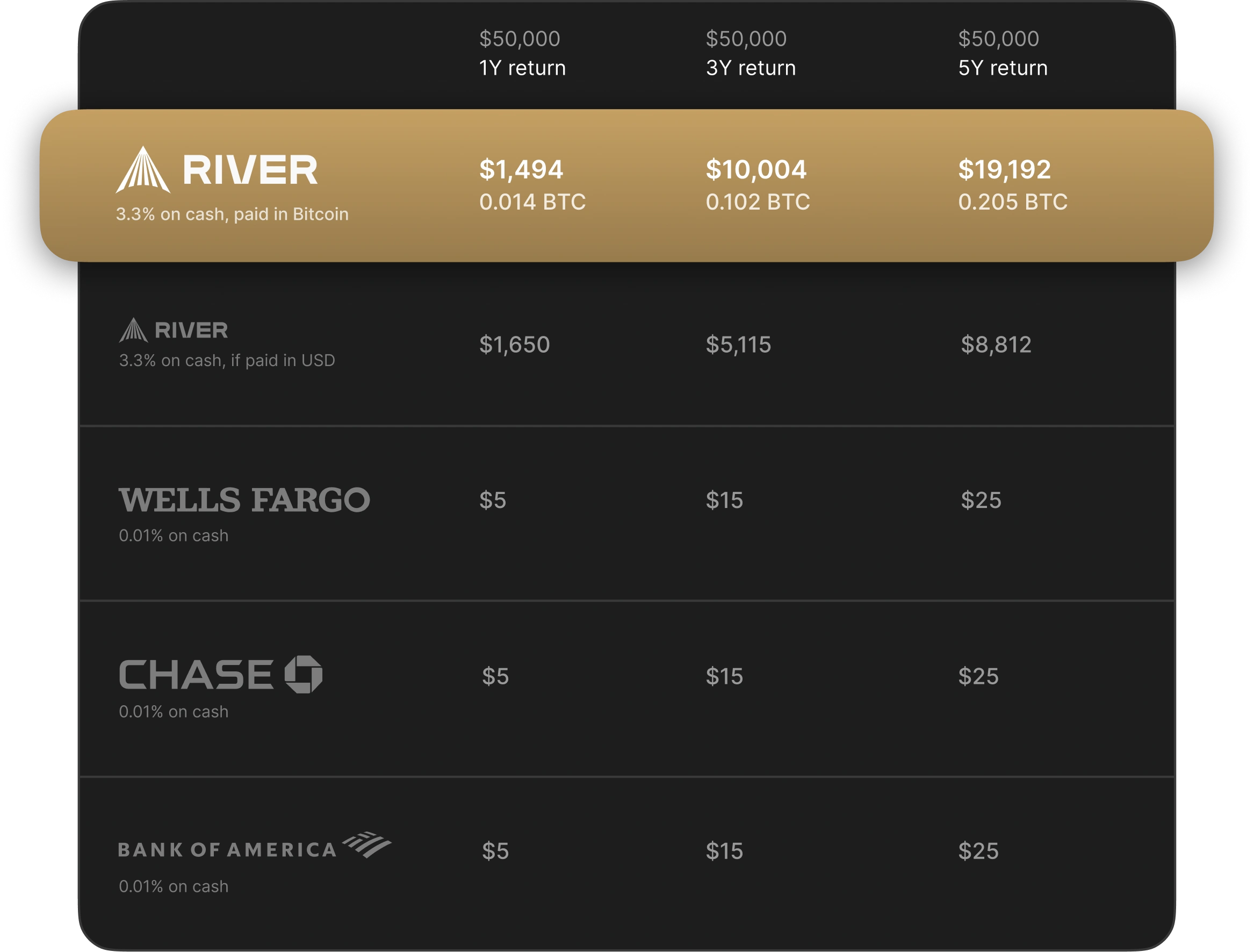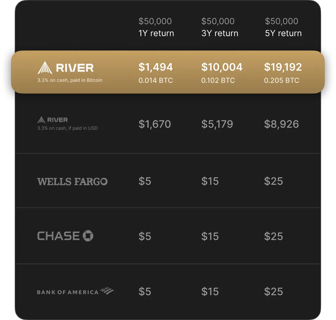 The table is for illustrative purposes only. It compares estimated yields and annual earnings calculated from: the yield as of 10/07/2024 of a Bitcoin interest on cash offered in River, and the APY offered by other service providers as found on their websites (data correct as of 10/08/2024 for - Way2Save®, Chase Savings℠, and Bank of America Advantage Savings). Yields will fluctuate over time, and are not a forecast or guarantee of future earnings.