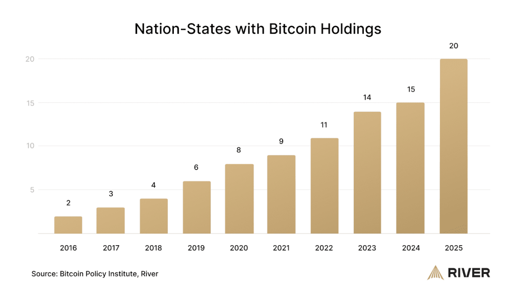 In November 2025, the Czech National Bank became the first central bank to buy bitcoin with a $1 million “test” transaction. That makes the Czech Republic the 20th nation-state to own bitcoin. If the current trend of nation-state bitcoin adoption continues, central banks may view bitcoin the same way they view gold in just a few years.