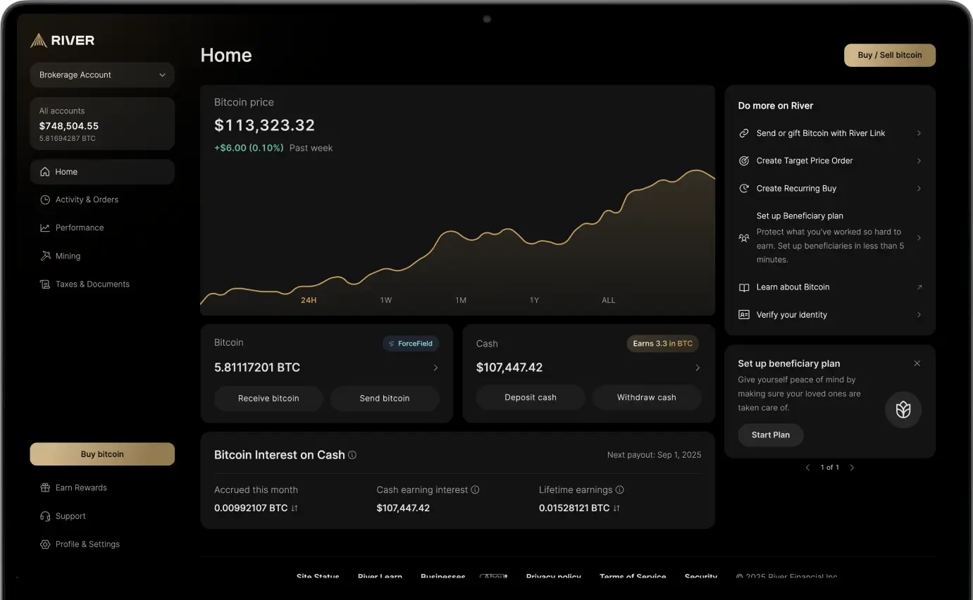 Have a lifetime of peace of mind knowing your Bitcoin passes directly to your loved ones with River's beneficiary plans.